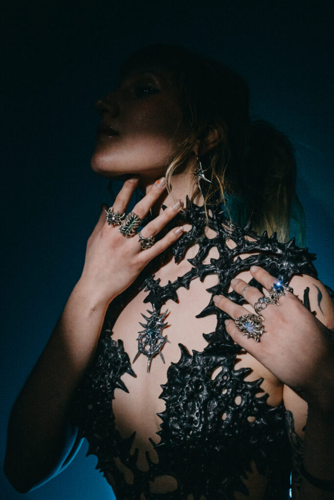 Cyber_Mantis_ est une artiste et bijoutière suisse autodidacte. Son univers, inspiré de la mythologie, des mondes fantastiques et de la science-fiction, génère une esthétique singulière et imaginaire. Son artisanat représente la fusion entre la technologie, la nature et l’art. Chaque pièce est unique et faite à la main. Elles sont inspirées par la bionique, la cybernétique, par les royaumes fantastiques, ainsi que par des mondes aliens.