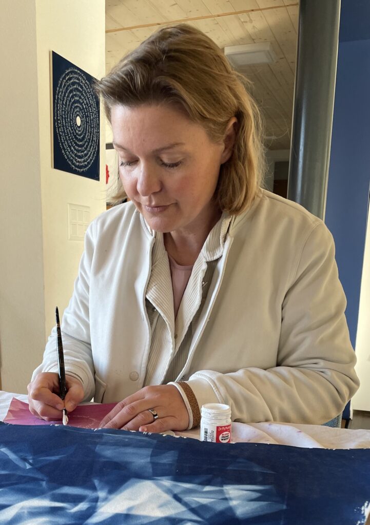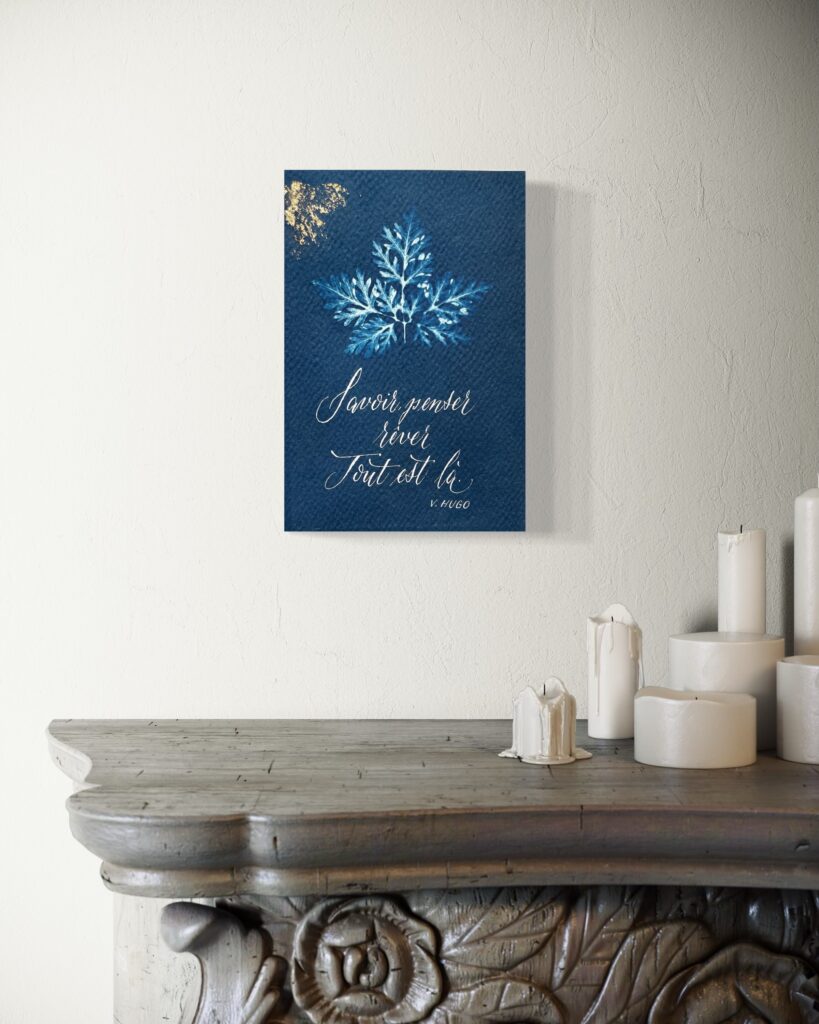 Amoureuse des mots et de leur pouvoir, elle crée également des tableaux en cyanotype, où chaque phrase déposée devient une caresse pour l’âme.