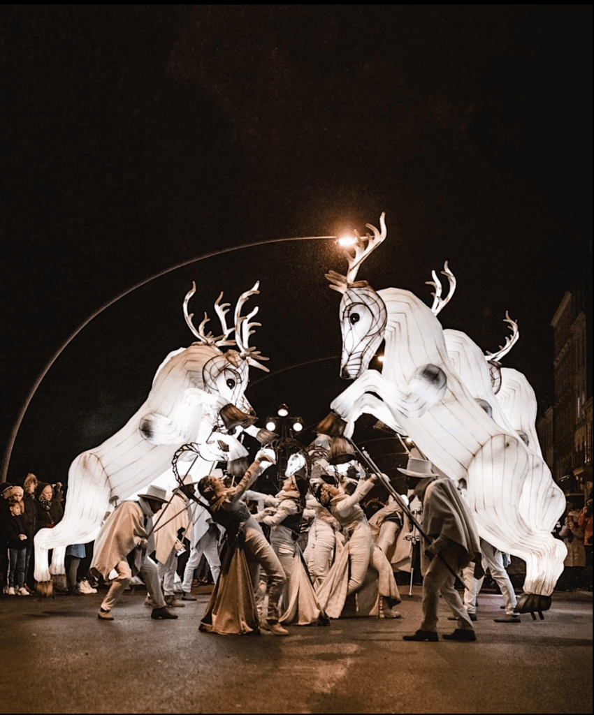 Une horde de cerfs et de biches se prêtent à d’étonnantes danses comme une ode à l’amour, un hommage à la nature. Géants fascinants, ils nous apportent de la poésie pleine de puissance et de vie. Un gracieux ballet urbain, une rencontre improbable et unique dans nos rues, qui deviennent ainsi, le théâtre des plus belles histoires d’amour.